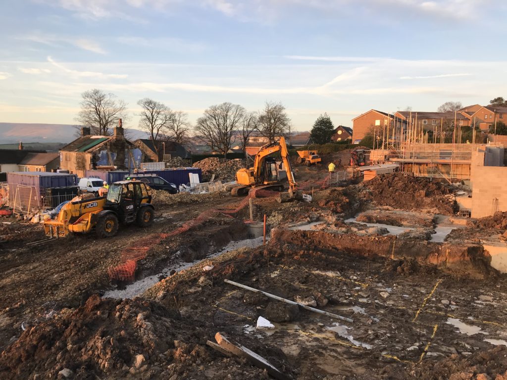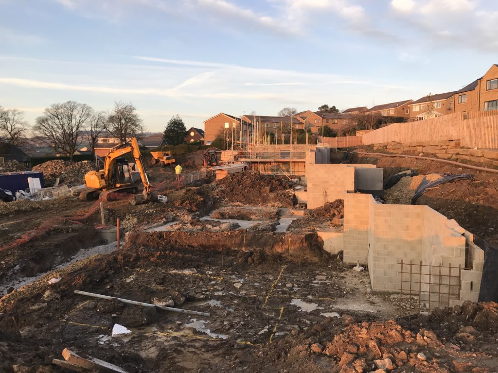 The retaining wall which runs across the back of the site and holds back the rear gardens has been constructed across plots 2 to 6. Plot 1 is being excavated now, together with foundations for plots 3 to 6. Work is progressing as planned and with an additional team of builders and joiners starting after the Christmas break, you will soon see more houses rising out of the ground! See the photos below.